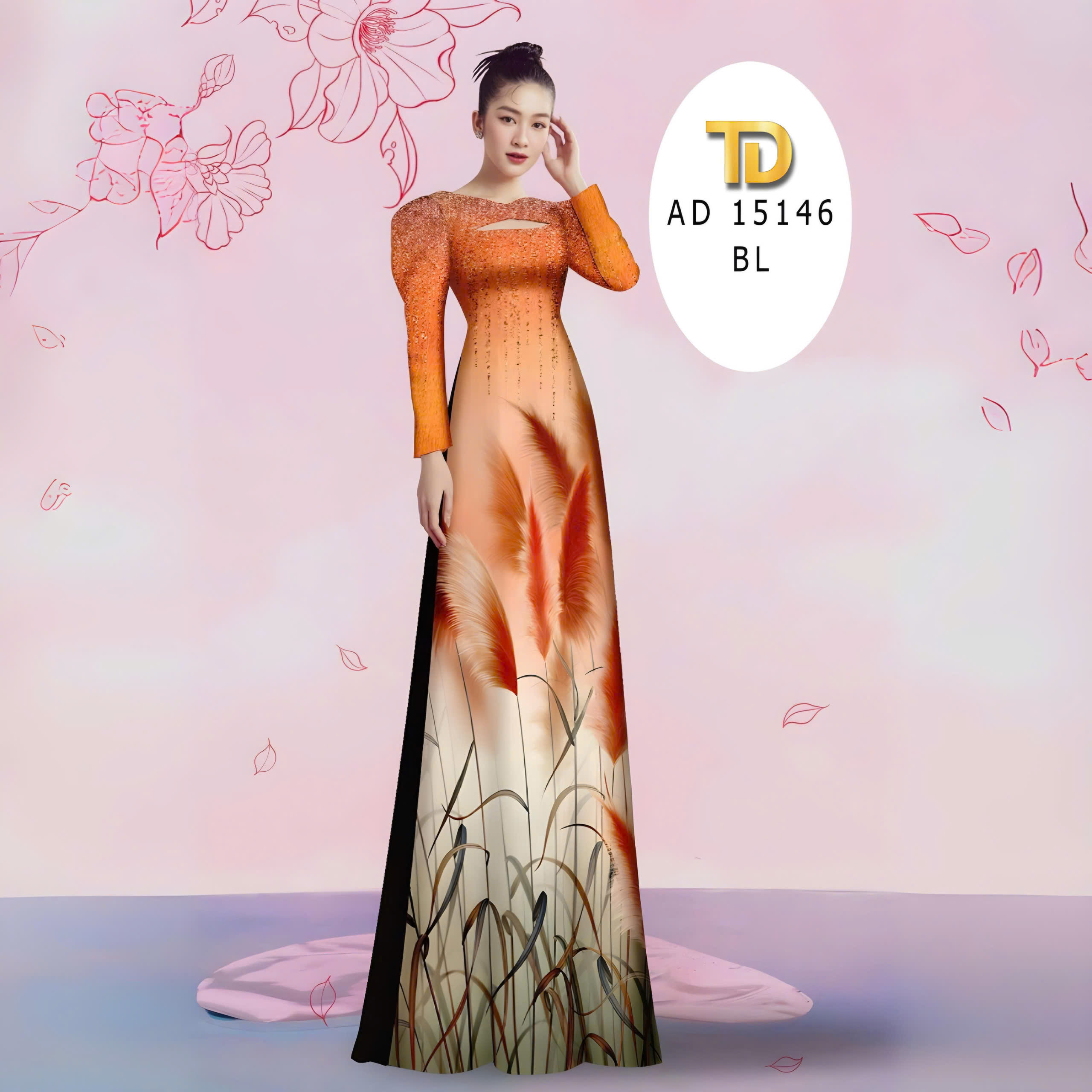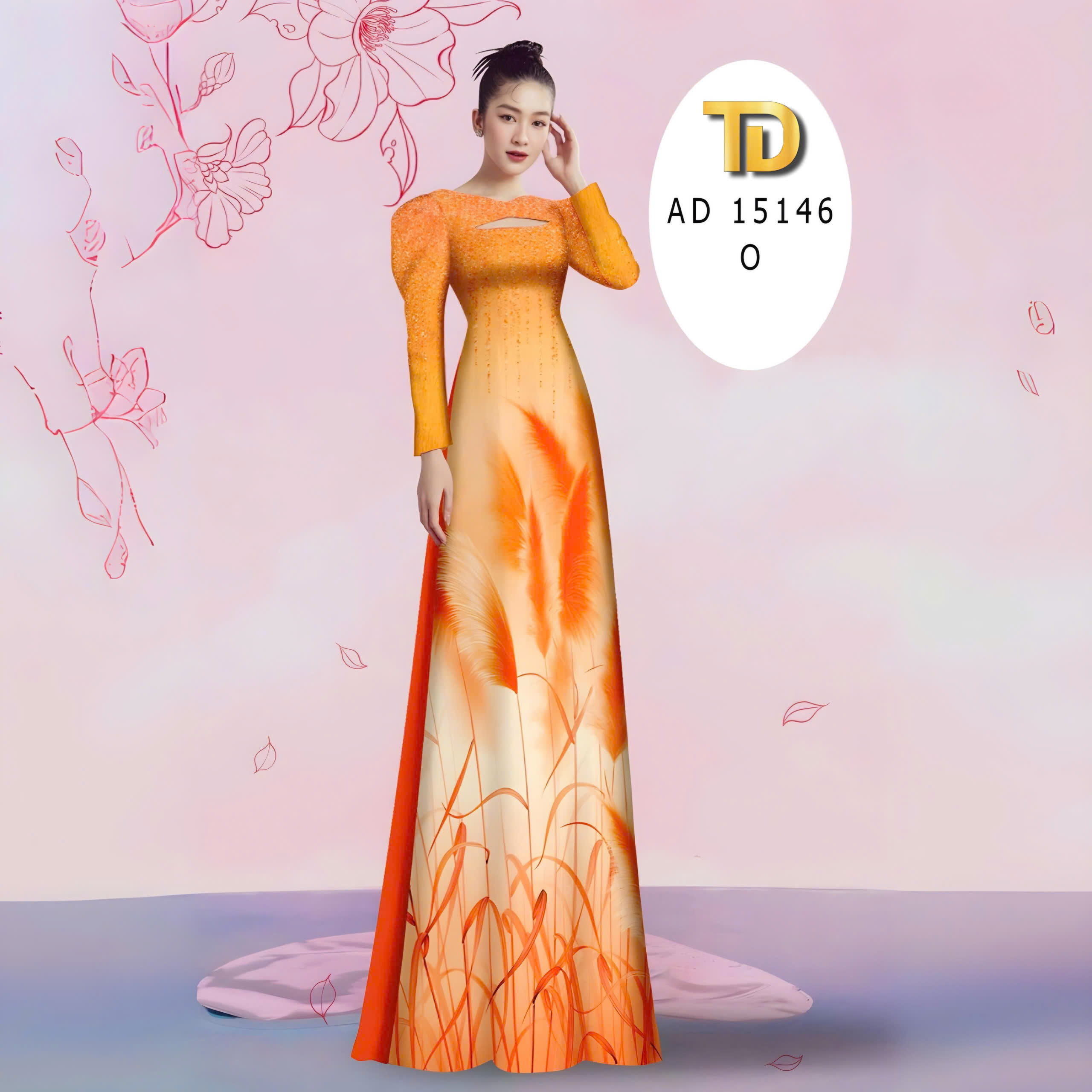 + Họa tiết hoa cỏ bông lâu in 3D dưới tà, phần trên ngực in 3D kim tuyến sáng lấp lánh siêu sang